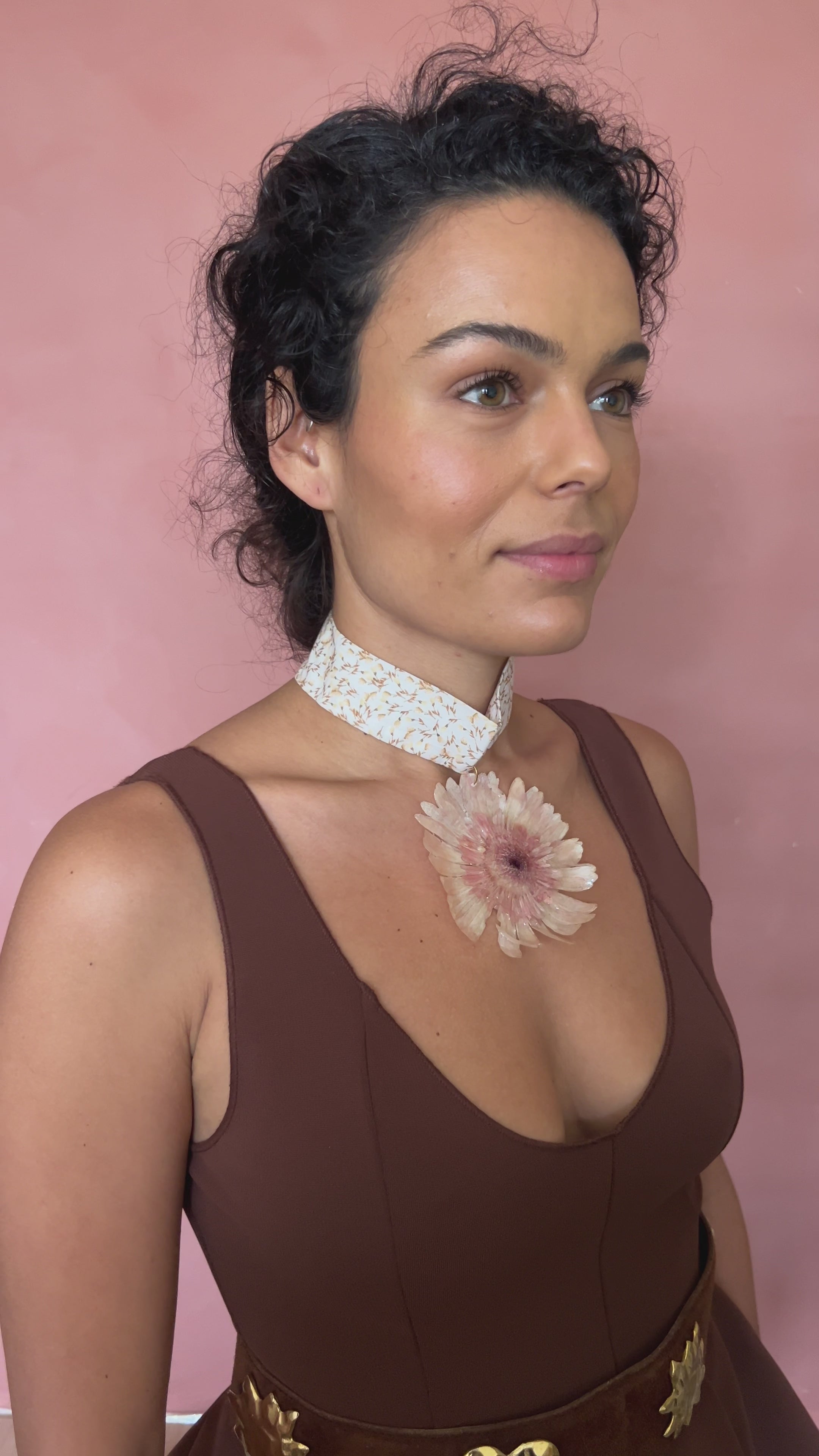 midsize gerbara on bordeaux cotton choker.